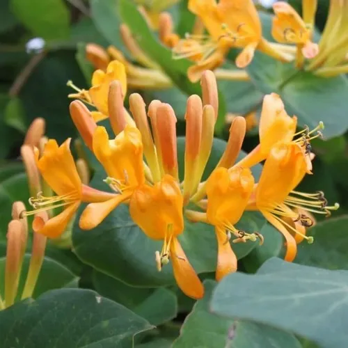 Главное достоинство сорта — цветение. В мае побеги покрываются крупными трубчатыми цветками насыщенного янтарно-оранжевого цвета, собранными в пышные кисти. Цветение продолжается до июля, иногда до августа, и обновляется волнами. Аромат лёгкий, сладковатый, особенно заметен вечером, привлекает бабочек и пчёл. После цветения появляются декоративные красные ягоды, которые сохраняют эффектность до осени.