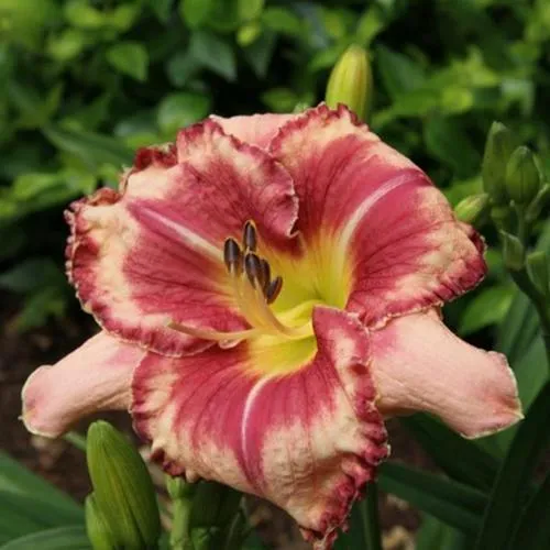 Цветок имеет впечатляющий размер от 12 до 14 см в диаметре и состоит из широких, слегка загнутых вниз лепестков, расположенных в красивых двухъярусных рядах. Удивительное сочетание кремово-розового фона с темно-красным центром и бордовым краем создает эффектный контраст. Сердцевина цветка ярко-желтая, что добавляет нотки свежести и яркости. Аромат цветка является приятным и нежным.