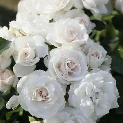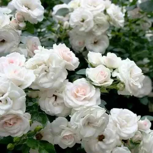 - Цветки: махровые, диаметром 6–8 см, белые с легким розовым румянцем в прохладную погоду.